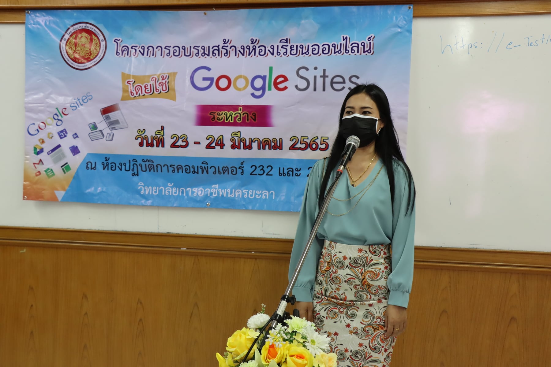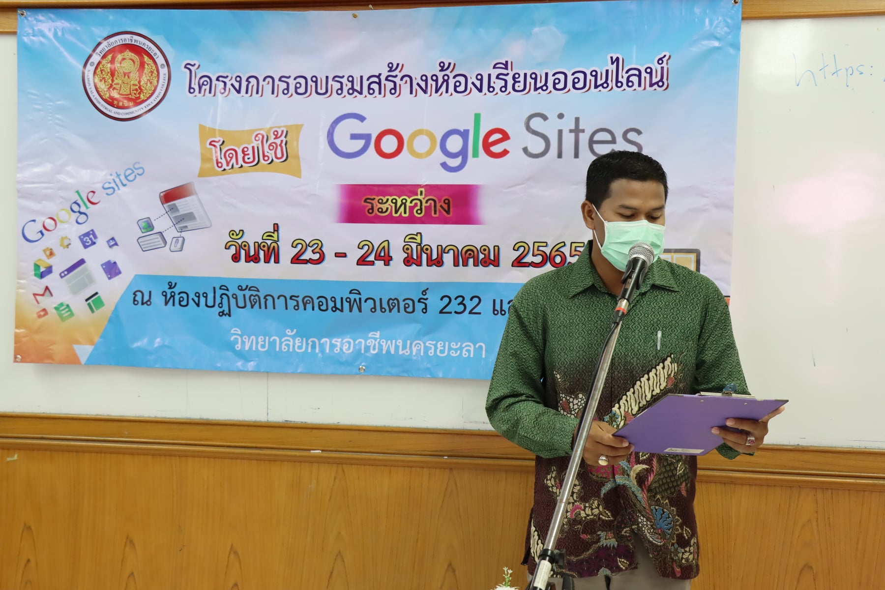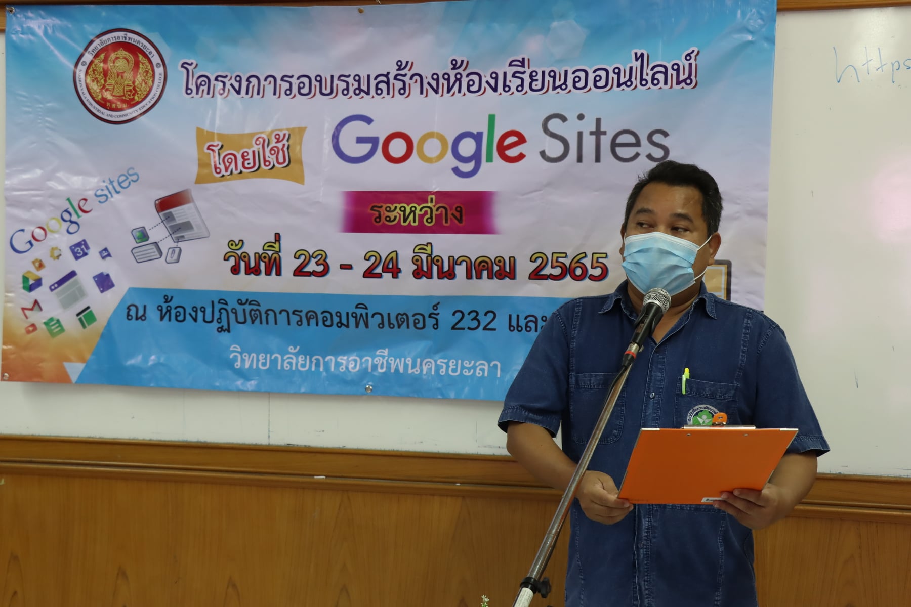 วันพุธ ที่ 23 มีนาคม 2565 นายภาณุวัฒน์ บุญยะรัตน์ ผู้อำนวยการวิทยาลัยการอาชีพนครยะลา มอบหมายให้นายชัยพันธุ์ กชกันพยันต์ รองผู้อำนวยการ ประธานในพิธีเปิดโครงการ โดยมีนายอาหามะ ดือเร๊ะ รองผู้อำนวยการ ฝ่ายวิชาการ พร้อมด้วย คณะครู และบุคลากรทางการศึกษา เข้าร่วมโครงการอบรมสร้างห้องเรียนออนไลน์ โดยใช้ Google Site ณ ห้องปฏิบัติการคอมพิวเตอร์ 232 วิทยาลัยการอาชีพนครยะลา