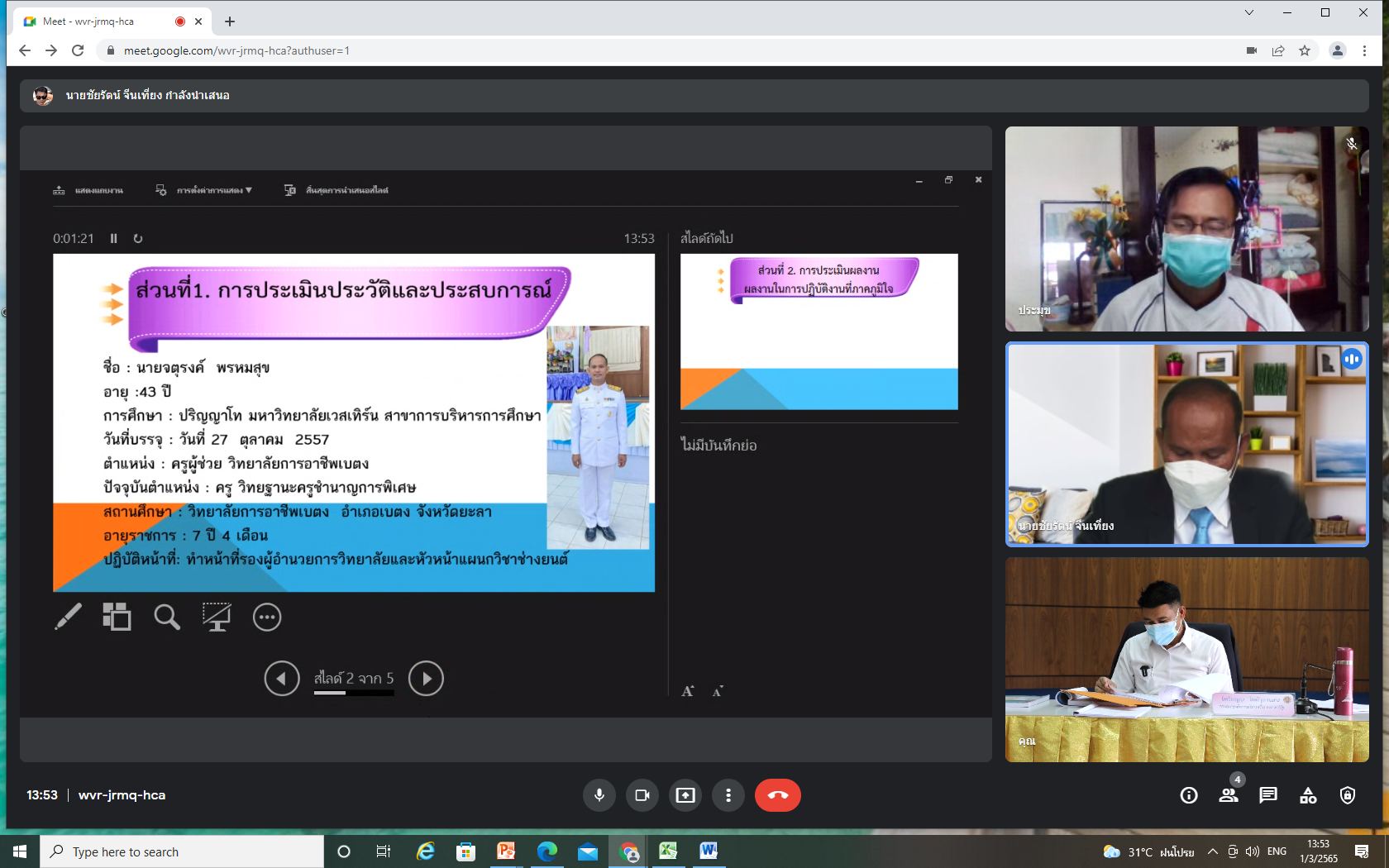 วันอังคารที่ 1 มีนาคม 2565 นายภาณุวัฒน์ บุญยะรัตน์ ผู้อำนวยการวิทยาลัยการอาชีพนครยะลา ประธานกรรมการอาชีวศึกษาจังหวัดยะลา พร้อมด้วยผู้อำนวยการสถานศึกษาสังกัดอาชีวศึกษาจังหวัดยะลา จัดการประชุมเพื่อประเมินการคัดเลือกบุคคลเพื่อบรรจุและแต่งตั้งให้ดำรงตำแหน่งรองผู้อำนวยการสถานศึกษา ในสังกัดสำนักงานคณะกรรมการการอาชีวศึกษา การประเมินภาค ข ความเหมาะสมกับการปฏิบัติงานในหน้าที่ (ระดับอาชีวศึกษาจังหวัด) ณ วิทยาลัยการอาชีพนครยะลา และ Online ผ่านระบบ Zoom Meeting
