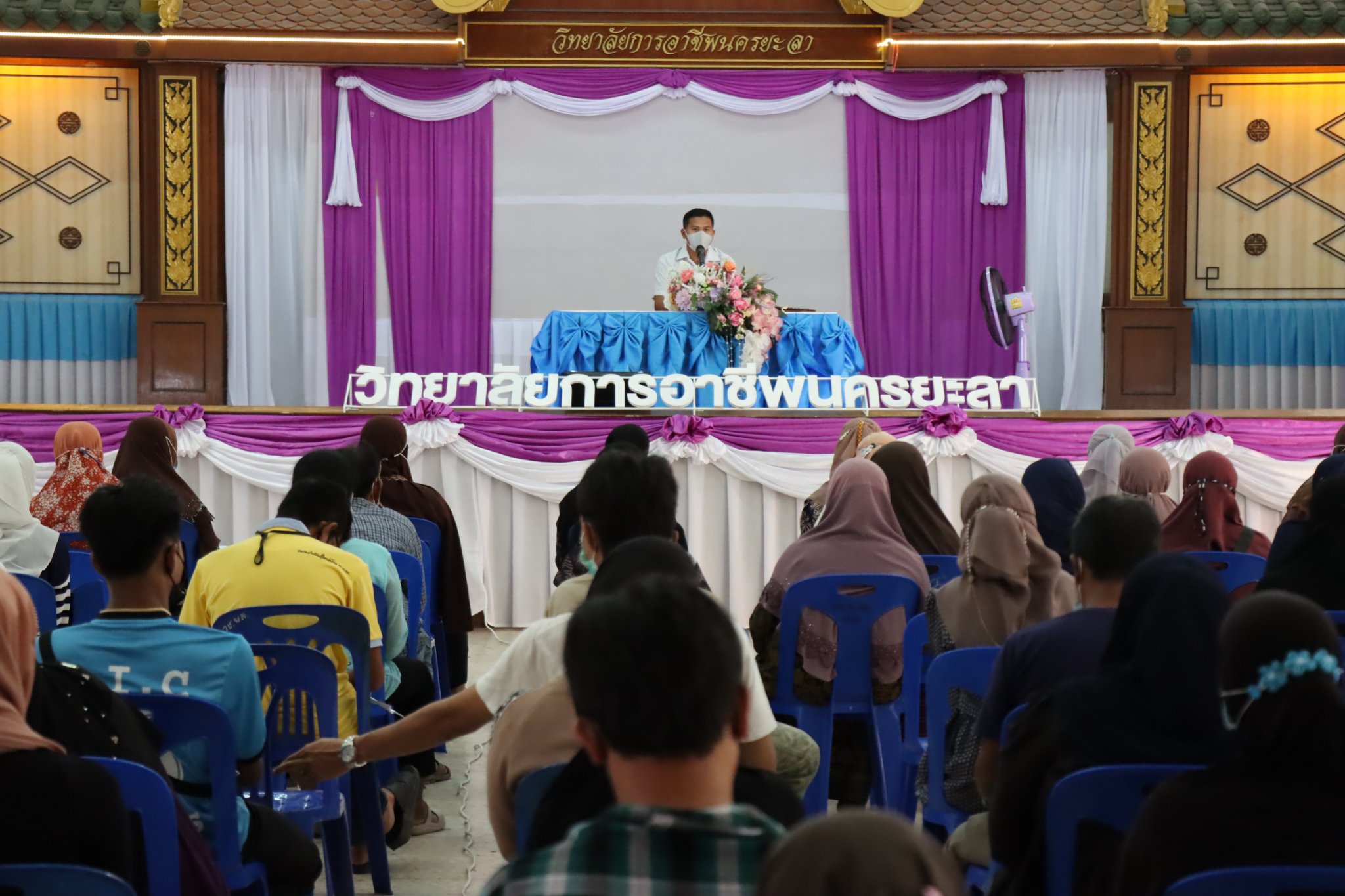 วันเสาร์ ที่ 28 พฤษภาคม 2565 นายภาณุวัฒน์ บุญยะรัตน์ ผู้อำนวยการวิทยาลัยการอาชีพนครยะลา พร้อมด้วยคณะผู้บริหาร ครู บุคลากรทางการศึกษา และผู้ปกครอง นักเรียน นักศึกษา เข้าร่วมโครงการประชุมผู้ปกครองนักเรียน นักศึกษา ระดับประกาศนียบัตรวิชาชีพ (ปวช.2 และ ปวช.3) ระดับประกาศนียบัตรวิชาชีพชั้นสูง (ปวส.2) ภาคเรียนที่ 1 ปีการศึกษา 2565 ณ หอประชุม วิทยาลัยการอาชีพนครยะลา