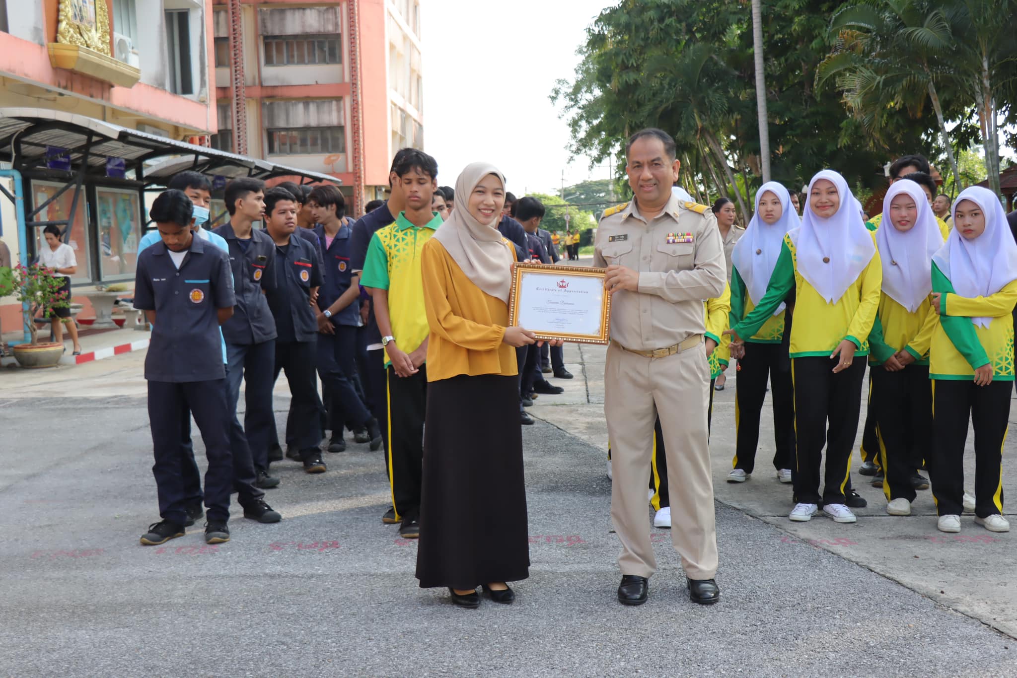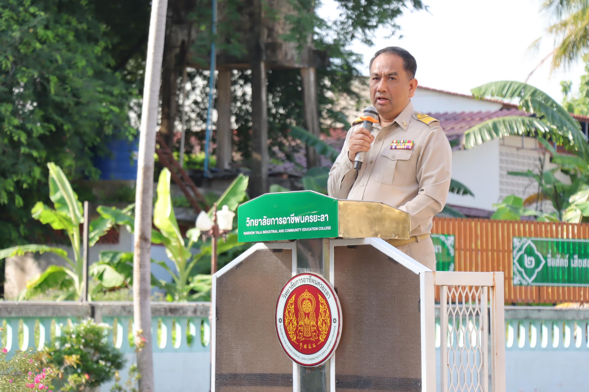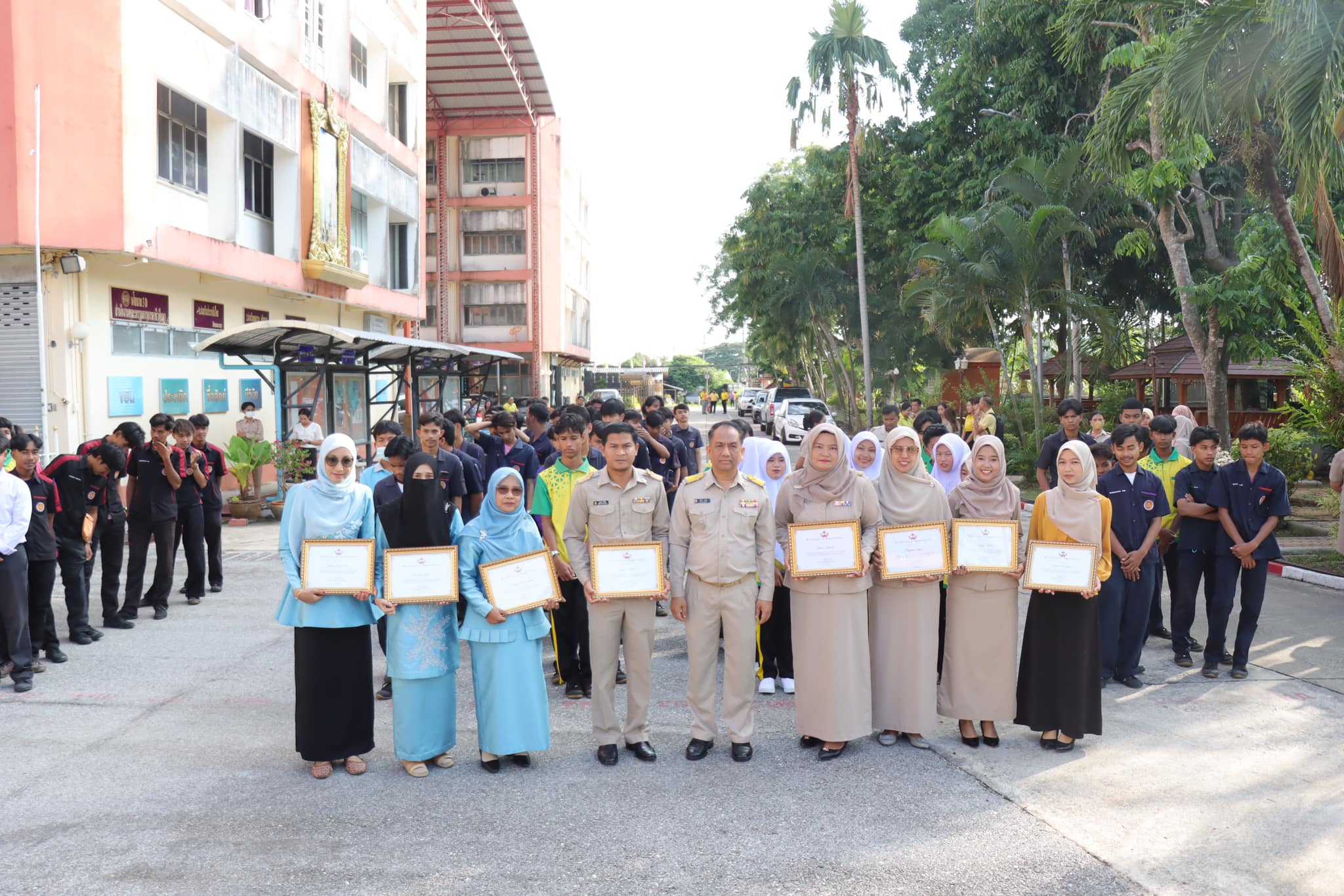 458180260 493475196921079 7219723845242148173 nวันอังคาร ที่ 3 กันยายน 2567 วิทยาลัยการอาชีพนครยะลา พร้อมด้วยคณะผู้บริหาร คณะครู บุคลากรทางการศึกษา และนักเรียน นักศึกษา ดำเนินกิจกรรมการเข้าแถวหน้าเสาธง ของนักเรียน นักศึกษา วิทยาลัยการอาชีพนครยะลา โดยมีนายมูฮำหมัด เจะสนิ ครูเวรวันนี้ พบปะพูดคุยกับนักเรียน นักศึกษา ชี้แจงข้อมูลข่าวสารให้กับนักเรียน นักศึกษาทราบ และให้โอวาทกับนักเรียน นักศึกษา และมอบเกียรติบัตรให้กับครู และนักศึกษาหลักสูตรวิชาชีพสระยะสั้น สาขาวิชาผ้าและเครื่องแต่งกาย เข้าร่วมมหกรรมผ้าไหม 2567 ไหมไทยสู่เส้นทางโลกครั้งที่ 13 งานแฟชั่นผ้าไหมไทยสู่สากล วันที่ 31 สิงหาคม 2567 ณ หอประชุมกองทัพเรือ  ณ บริเวณหน้าอาคารวิทยบริการ วิทยาลัยการอาชีพนครยะลา