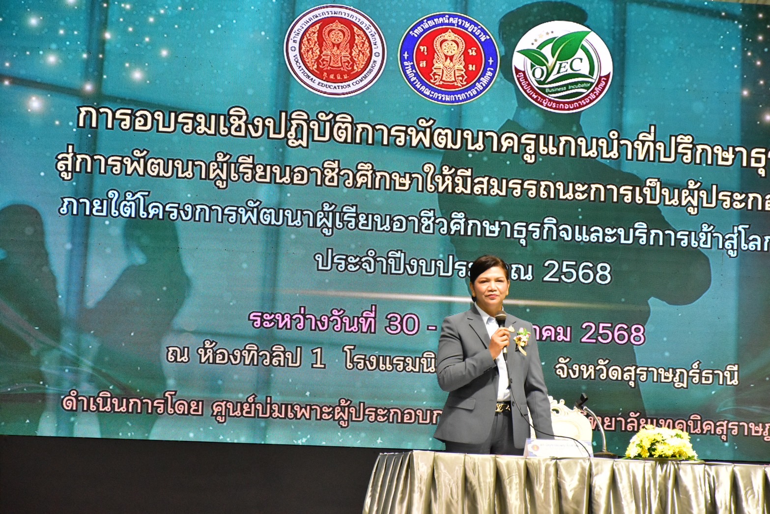 วันอังคาร ที่ 2 กันยายน 2568 นายไรฮ้าน กองสิน ผู้อำนวยการวิทยาลัยการอาชีพนครยะลา ได้มอบหมายให้ นางสาวฟูซียะห์ กาแลซา เข้าร่วมอบรมเชิงปฏิบัติการพัฒนาครูแกนนำที่ปรึกษาธุรกิจสู่การพัฒนาผู้เรียนอาชีวศึกษาให้มีสมรรถนะการเป็นผู้ประกอบการ ประจำปีงบประมาณ 2568 ระหว่างวันที่ 30-31 สิงหาคม 2568 ณ โรงแรมนิภาการ์เดินท์ จังหวัดสุราษฎร์ธานี