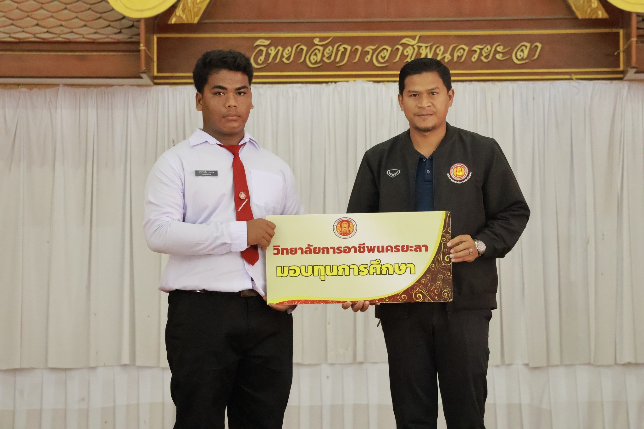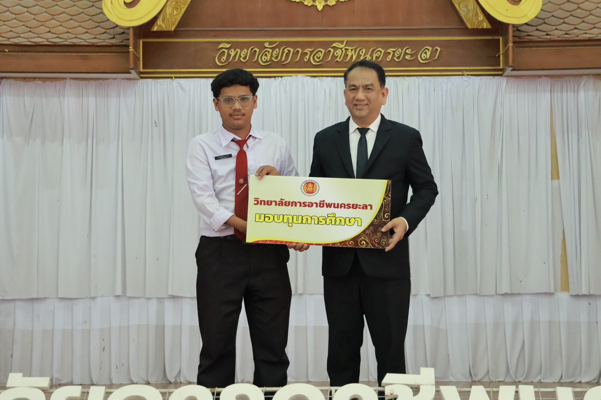 วันอาทิตย์ ที่ 2 พฤศจิกายน 2568 วิทยาลัยการอาชีพนครยะลา พร้อมด้วยคณะผู้บริหาร คณะครู และบุคลากรทางการศึกษา ดำเนินโครงการประชุมผู้ปกครอง และมอบทุนการศึกษาให้กับนักเรียน นักศึกษา ประจำภาคเรียนที่ 2 ปีการศึกษา 2568 หลักสูตรประกาศนัยบัตรวิชาชีพ (ปวช.) และหลักสูตรประกาศนัยบัตรวิชาชีพชั้นสูง (ปวส.) ณ หอประชุม วิทยาลัยการอาชีพนครยะลา