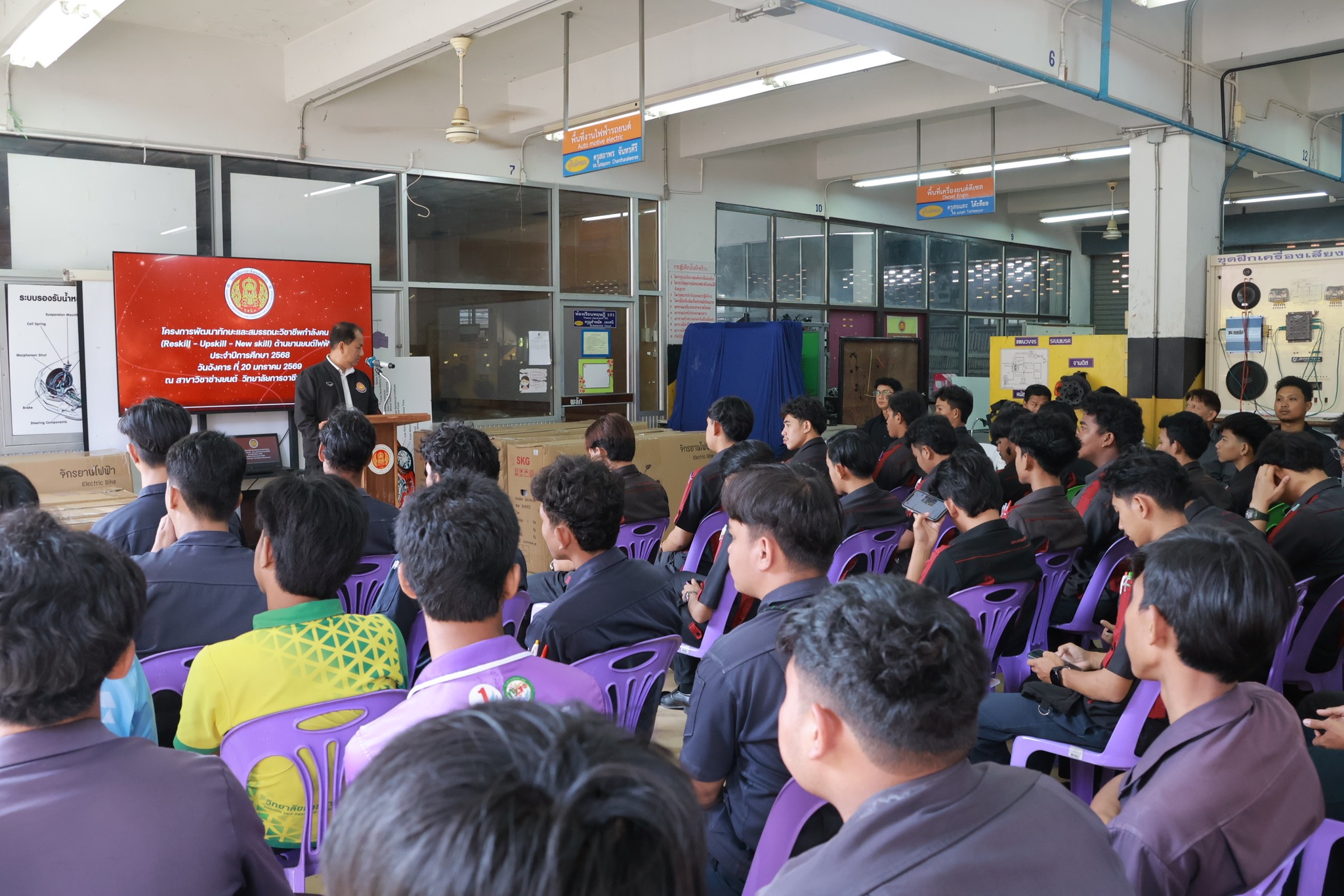 วันอังคาร ที่ 20 มกราคม 2569 นายไรฮ้าน กองสิน ผู้อำนวยการวิทยาลัยการอาชีพนครยะลา พร้อมคณะผู้บริหาร คณะครูสาขาวิชาช่างยนต์ ดำเนินโครงการพัฒนาทักษะและสมรรถนะวิชาชีพกำลังคน (Reskill - Upskill - New skill) ด้านยานยนต์ไฟฟ้า ประจำปีการศึกษา 2568 โดยมี นายศุภกร ศรีสวัสดิ์ และนายวิษนุพงศ์ รุ่งเรือง จากบริษัท King Chin Power เป็นวิทยากรให้ความรู้ในครั้งนี้ ณ แผนกสาขาวิชาช่างยนต์ วิทยาลัยการอาชีพนครยะลา